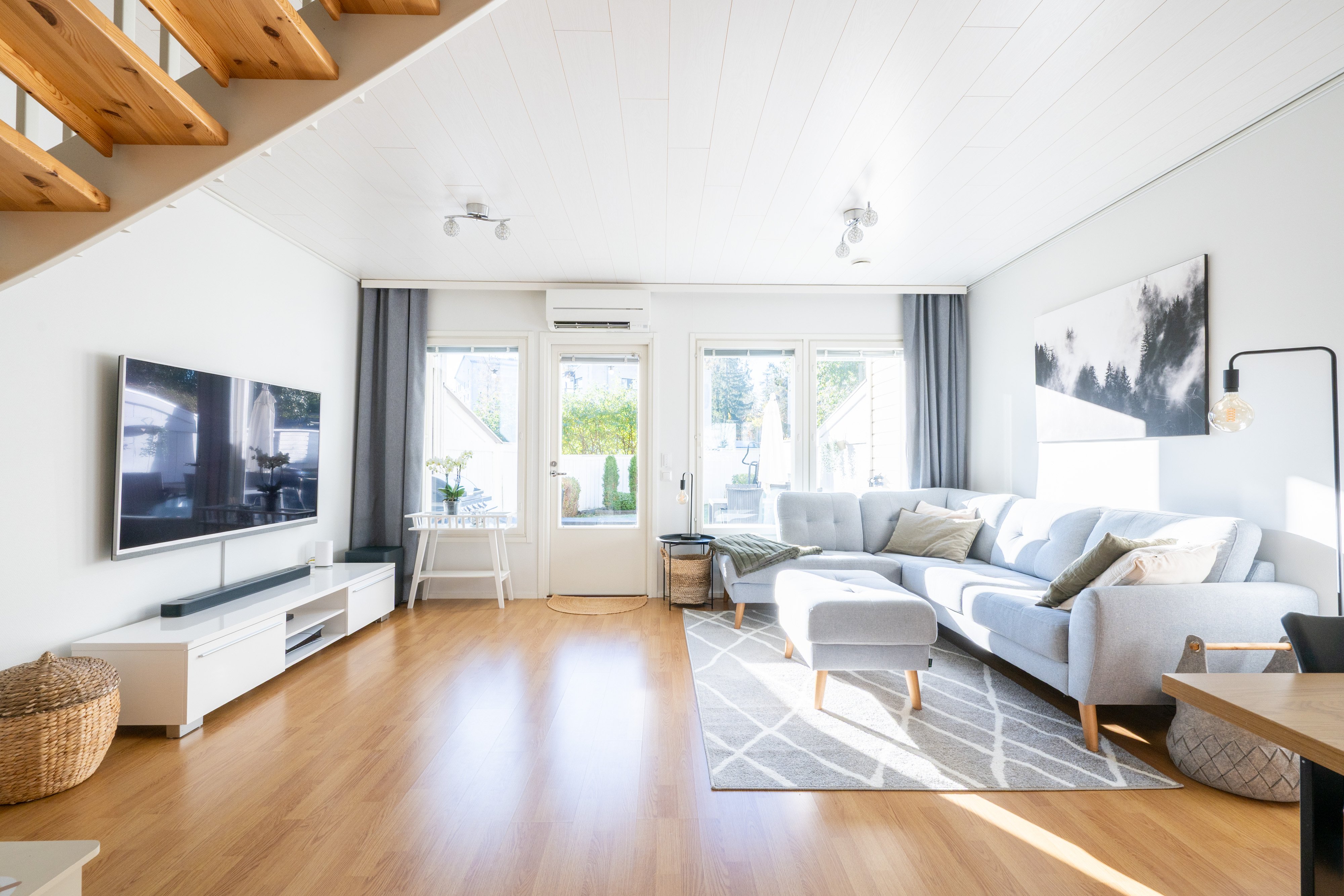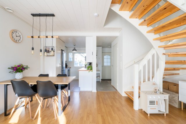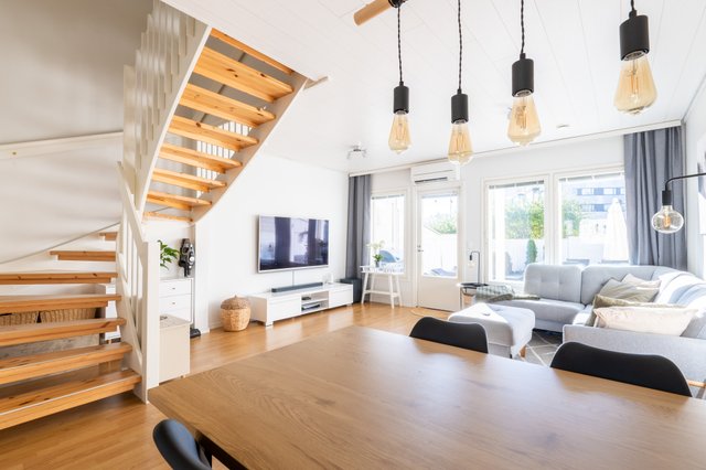 Asunnossa on kaksi kerrosta, ja alakerrasta löytyy valoisa olohuone, joka jatkuu sujuvasti keittiöön. Keittiössä on kaikki tarvittavat laitteet, kuten induktioliesi ja astianpesukone, mikä tekee arjesta sujuvaa. Kaksi makuuhuonetta tarjoavat tilaa perheelle tai työtilaksi. Kylpyhuoneessa on lattialämmitys ja sauna, jossa rentoutua päivän päätteeksi.