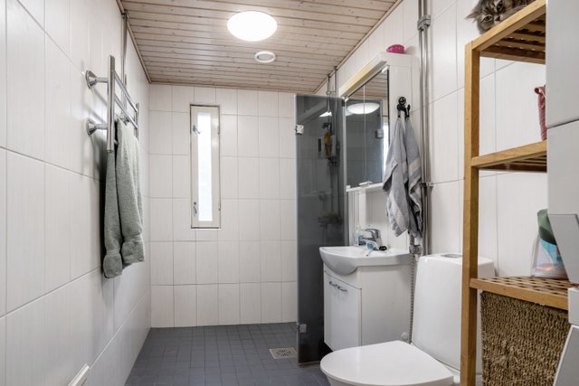 - WC-istuin, suihku, suihkuseinä, pesukoneliitäntä, allaskaappi, pesuallas, peilikaappi, ja bidee-suihku