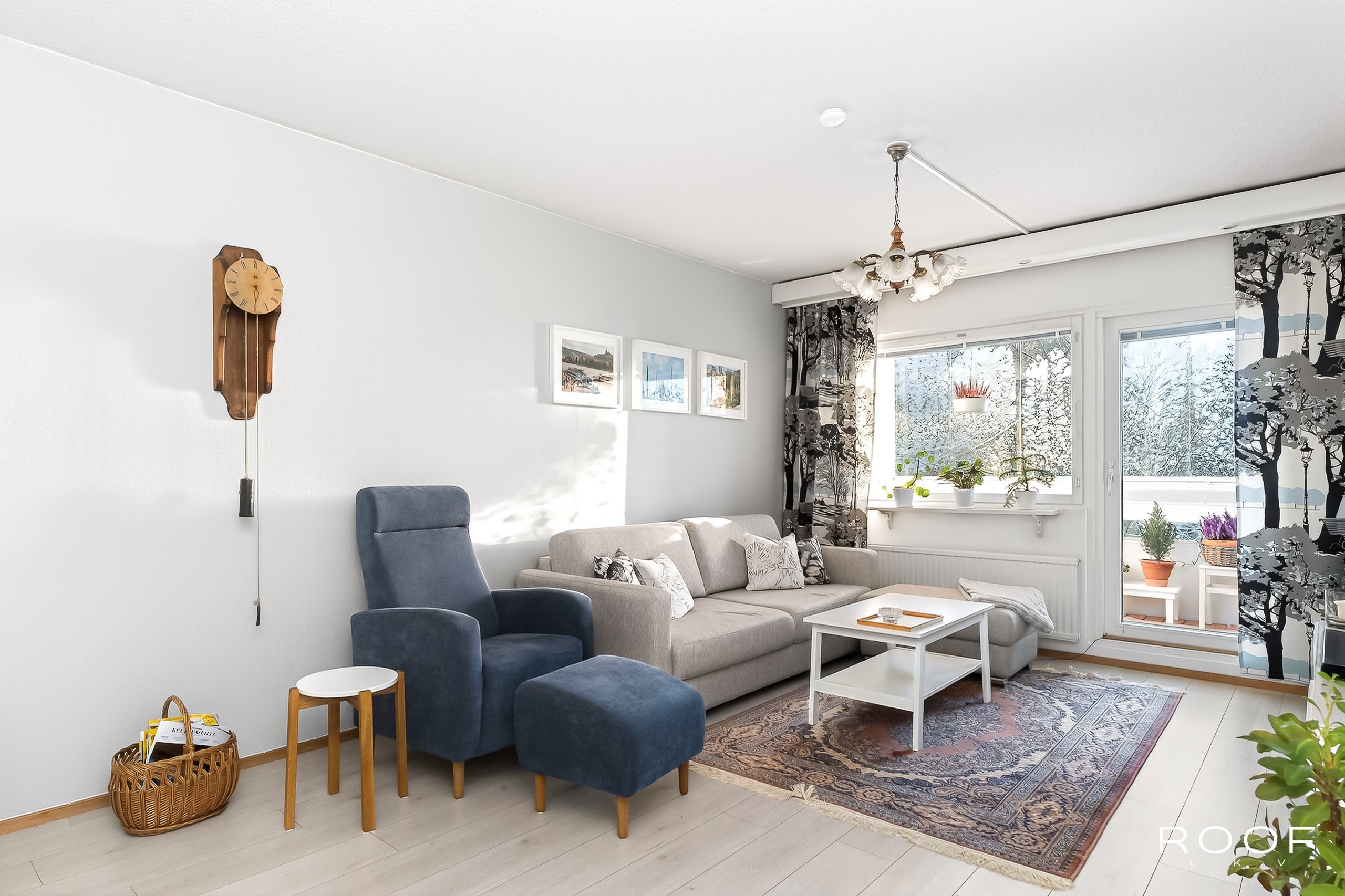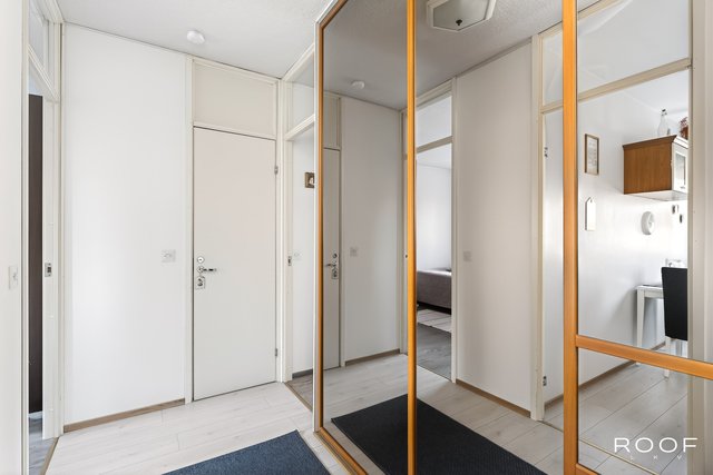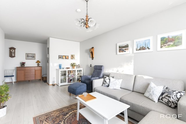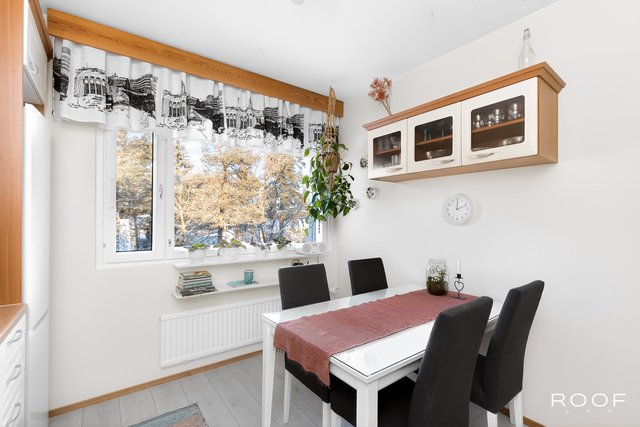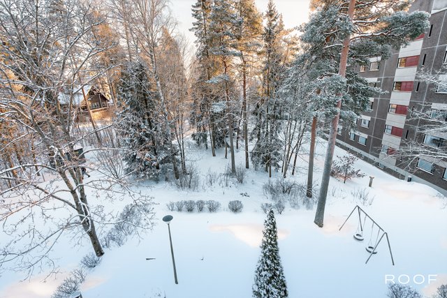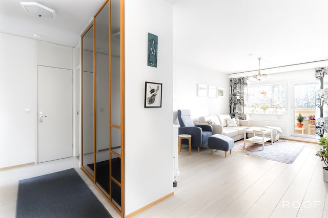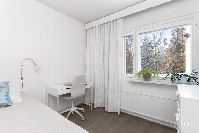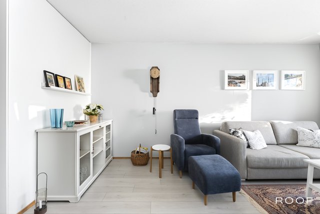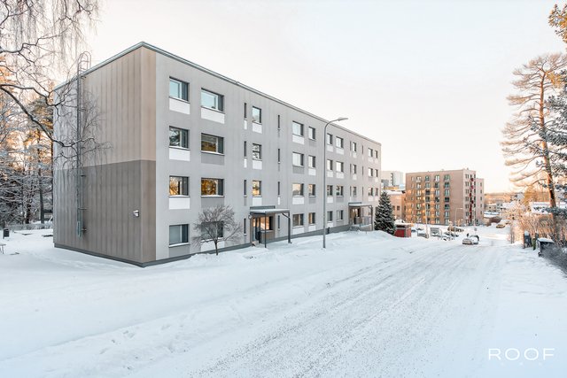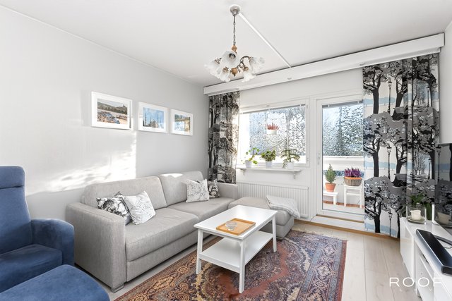 Tämä ylimmän kerroksen päätyhuoneisto hurmaa valoisuudellaan. Asunnon. suuresta olohuoneesta on käynti asunnon lasitetulle parvekkeelle, josta on vehreät näkymät.