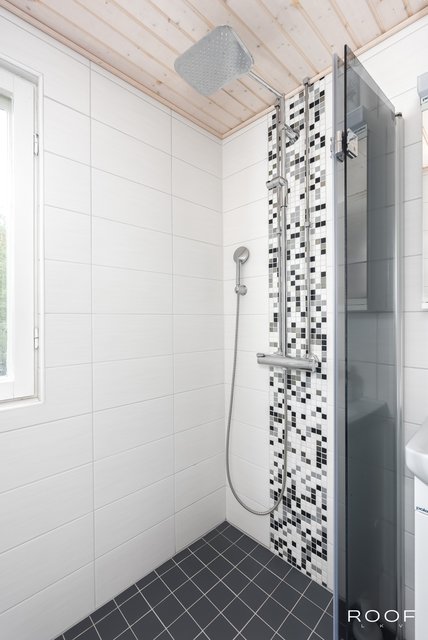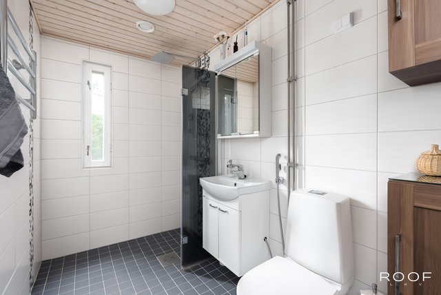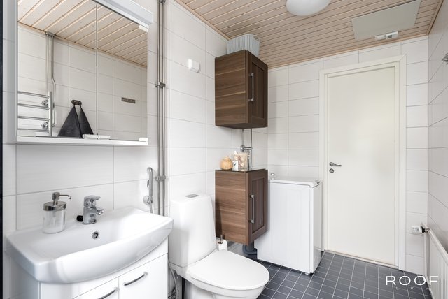 - Varustus: suihkuseinä, pesukoneliitäntä, wc-istuin, suihku, peilikaappi. Lattia: laatta. Seinät: kaakeli.