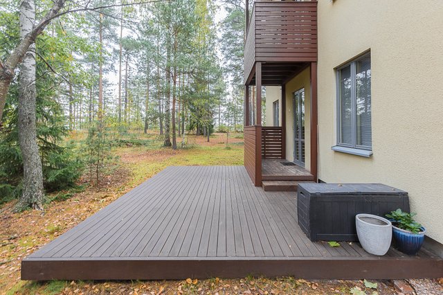 Keittiö ja olohuone ovat yhtenäistä, avaraa ja valoisaa tilaa, josta on käynti pariovien kautta ulos terassille. Terassilta on mm. vehreät näkymät viereiseen metsään.