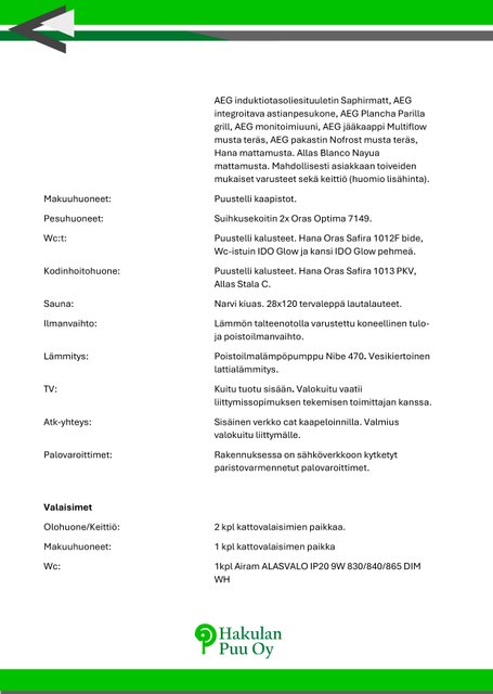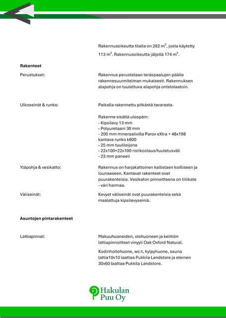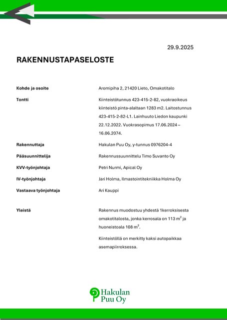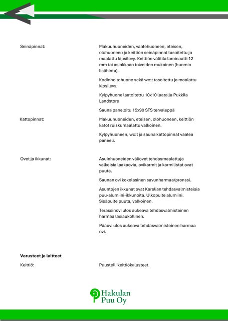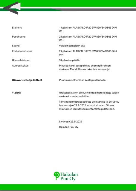 - Rakennustapaseloste liitteen mukainen varustelu, joka esitteen liitteenä.