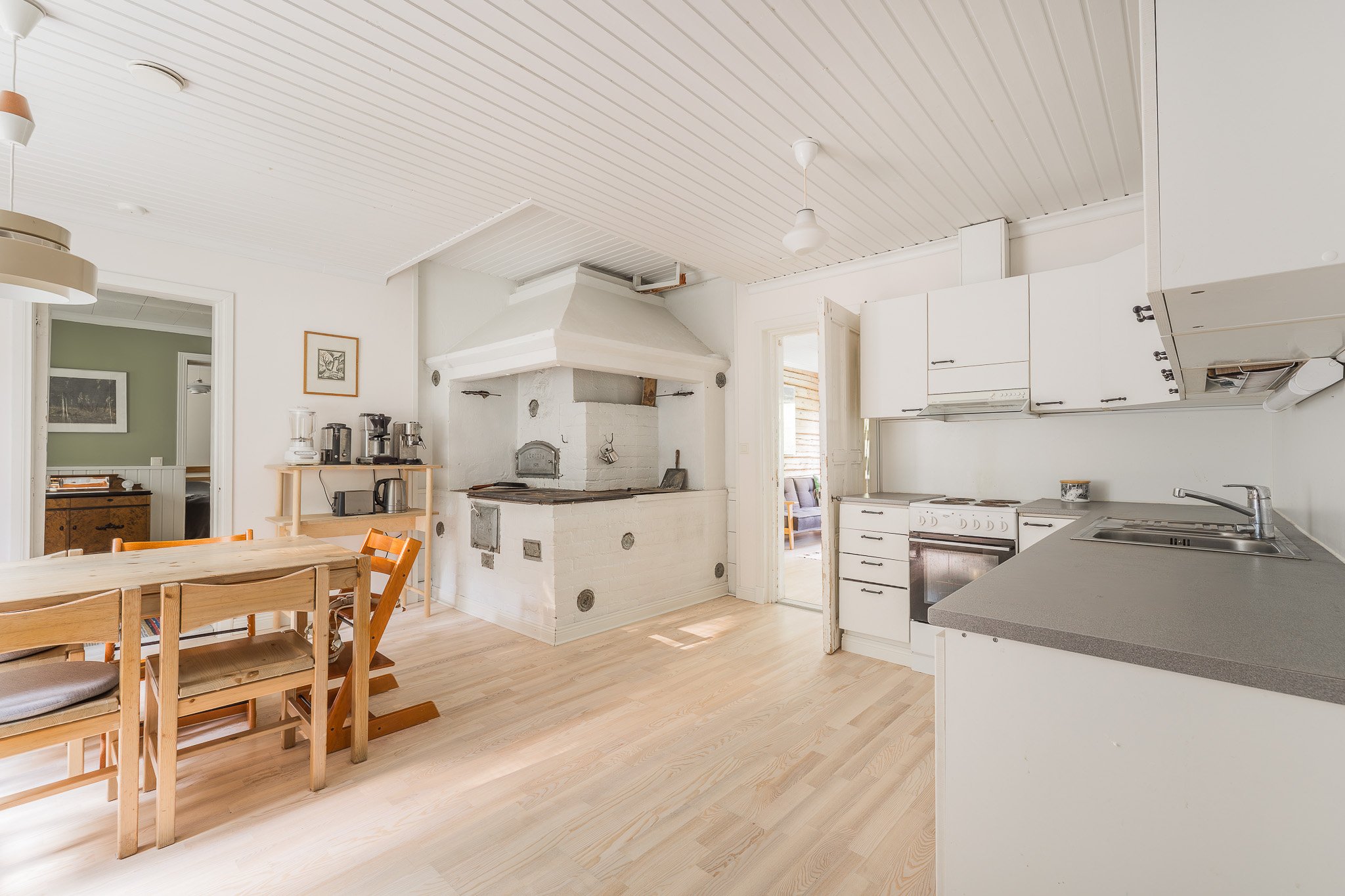- Keittiössä puuliesi, leivinuuni, astianpesukone, sähköliesi (2017), liesituuletin, jääkaappi/pakastin (2017). Keittiön remontissa ovet on uusittu, mutta osa rungoista on vanhoja. Keittiön kaappien ovet on maalattu ja vetimet vaihdettu 2021