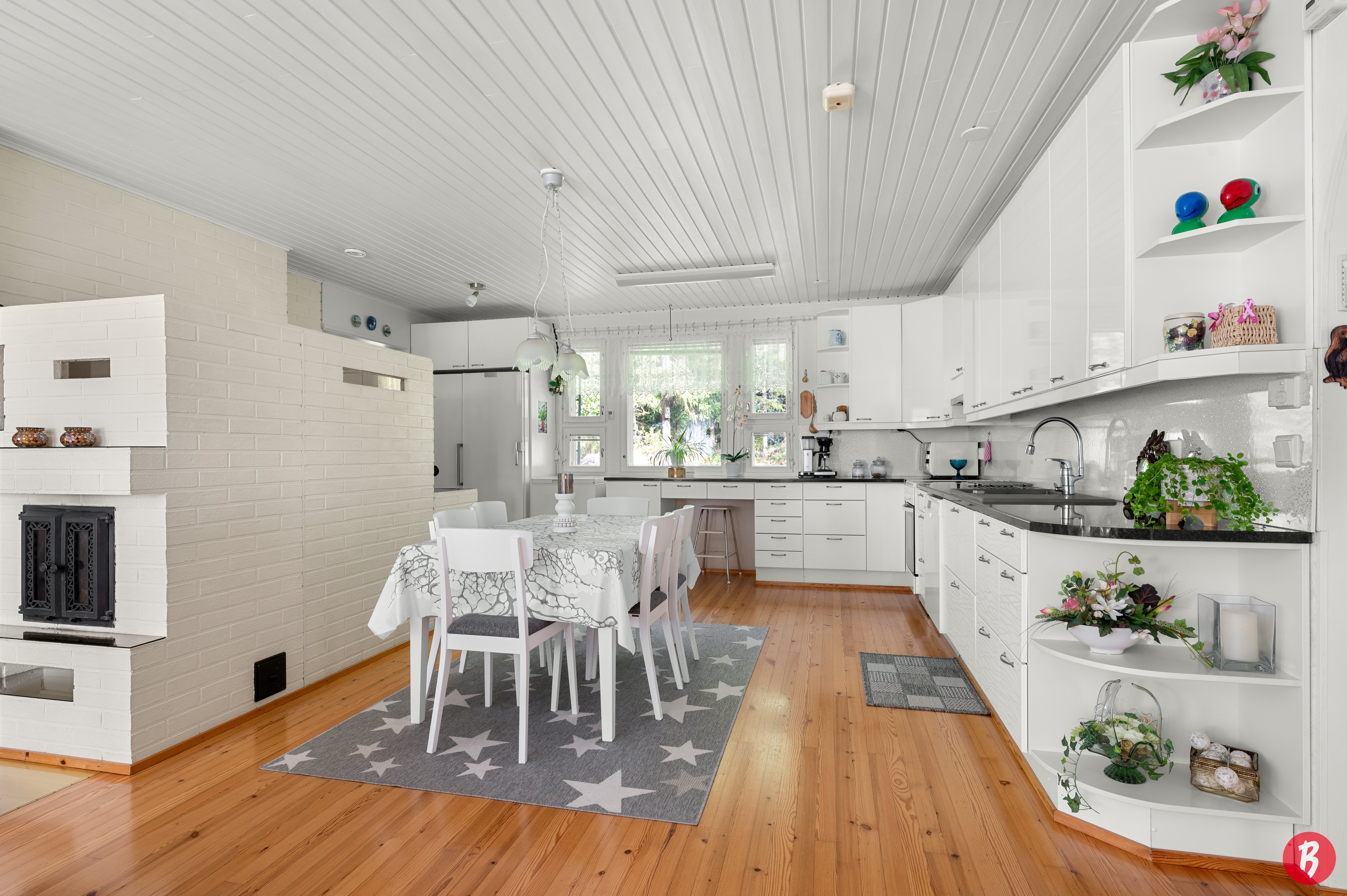 Talon sisätilat ovat viihtyisät ja käytännölliset. Neljä makuuhuonetta antaa tilaa isommallekin perheelle, ja olohuoneen varaava takka/leivinuunikokonaisuus tuo lämpöä ja tunnelmaa syys- ja talvi-iltoihin. Keittiö on uusittu, uudet kodinkoneet ja siellä on myös moderni puuliesi, jossa on keraaminen taso.