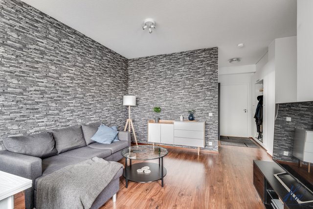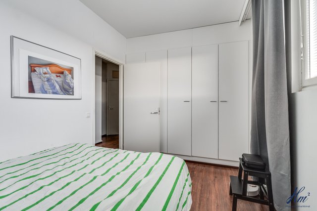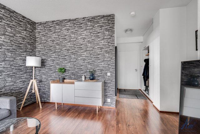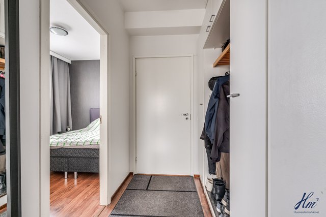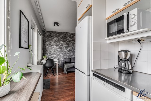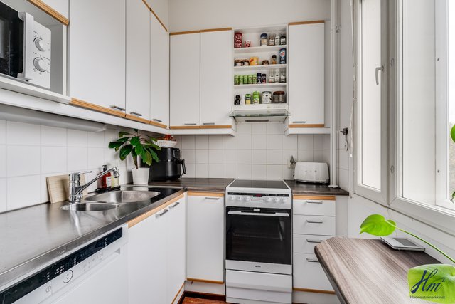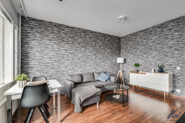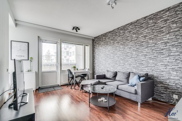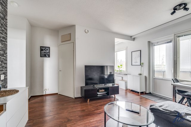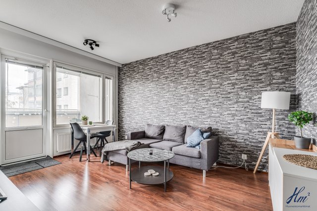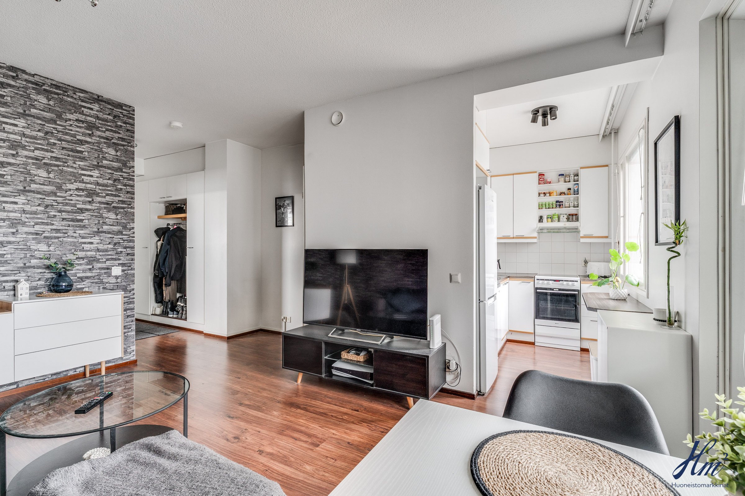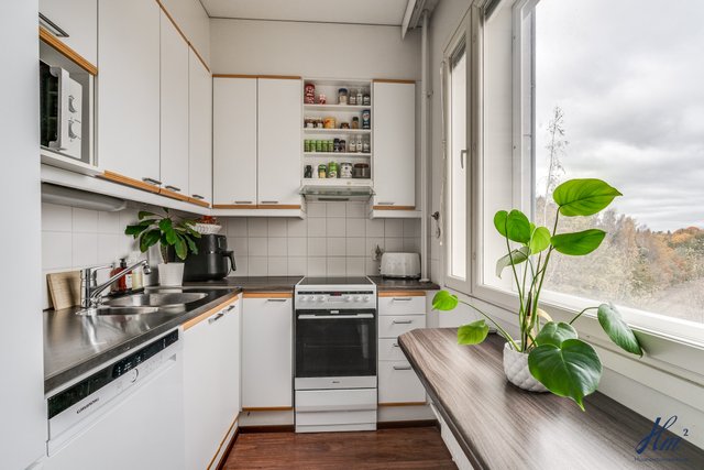 Kodin kompakti keittiö tarjoaa kaiken tarvittavan sujuvaan arkeen ja ruoanlaittoon – iso ikkuna tuo tilaan runsaasti luonnonvaloa. Olohuoneessa tunnelmaa luo moderni tehostetapetti, ja lasitetulla parvekkeella on mukava nauttia vaikka aamukahvit kaikessa rauhassa. Oman saunan ansiosta arkeen mahtuu myös ripaus luksusta.