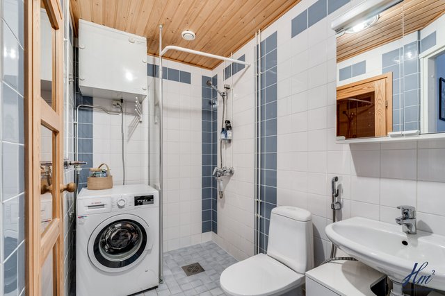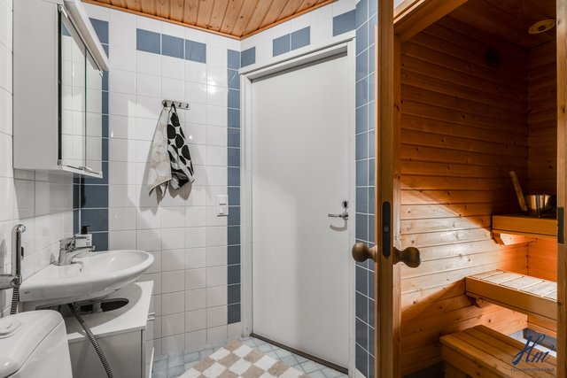 - Kokonaan laatoitettu tila, suihku, allas, peilikaappi, kaapisto, tilaa pesukoneelle., wc-istuin. Käynti saunaan.