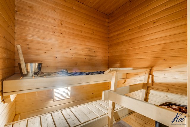 - Seinät katto paneloitu, lattia laattaa. Sähkökiuas.