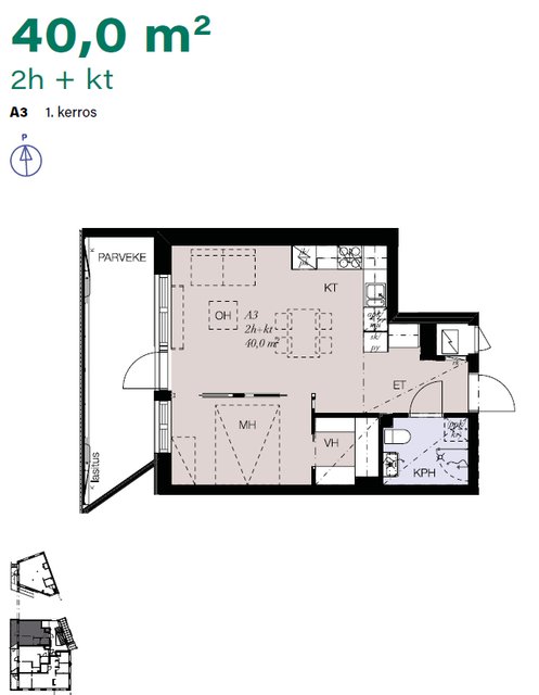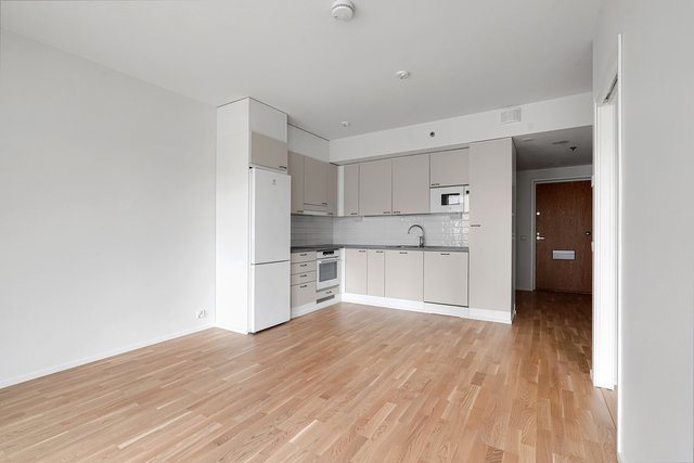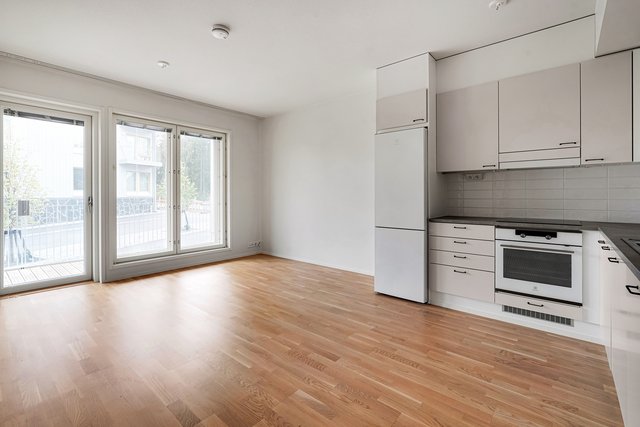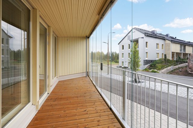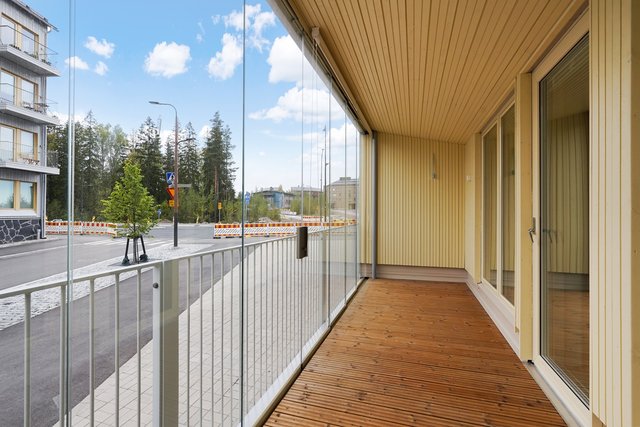 Asunnon sydän on tilava olohuone, josta on käynti lasitetulle parvekkeelle – täydellinen paikka nauttia aamukahvista tai rentoutua työpäivän jälkeen. Keittiö on varusteltu nykyaikaisin kodinkonein, mikä tekee ruoanlaitosta vaivatonta ja nautinnollista. Makuuhuoneessa on käytännöllinen vaatehuone, joka tarjoaa runsaasti säilytystilaa.