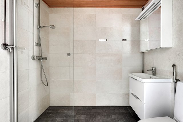 - WC-istuin, suihku, suihkuseinä, bidee-suihku, peilikaappi, allaskaappi, ja pesukoneliitäntä
