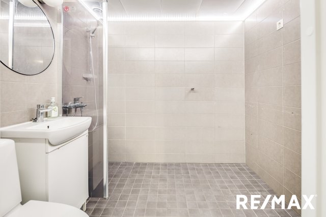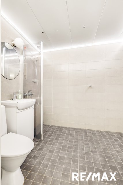 - WC-istuin, suihku, suihkuseinä, pesukoneliitäntä, peili, pesuallas, ja allaskaappi