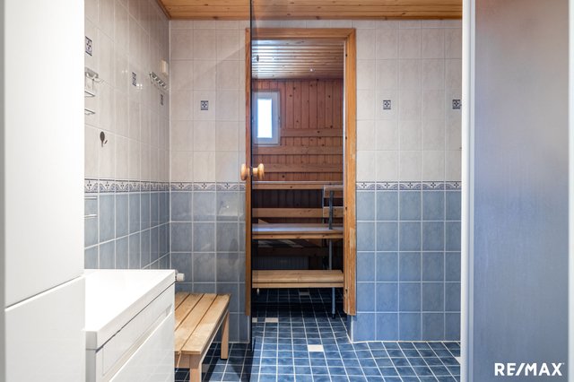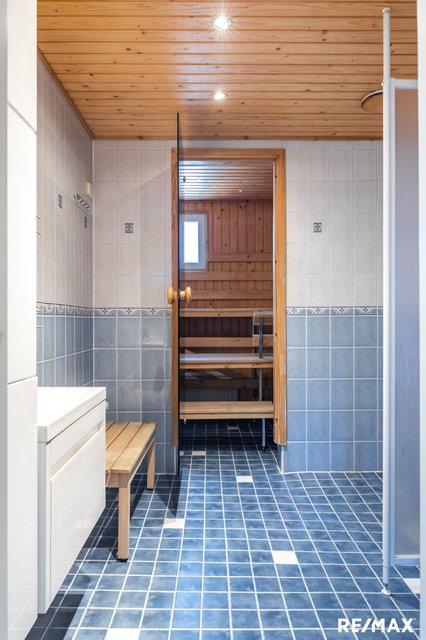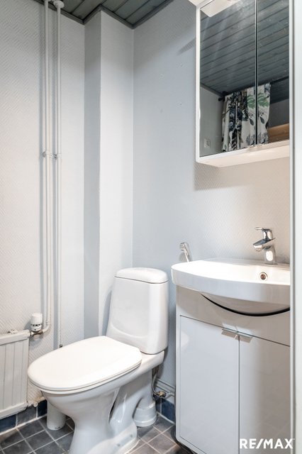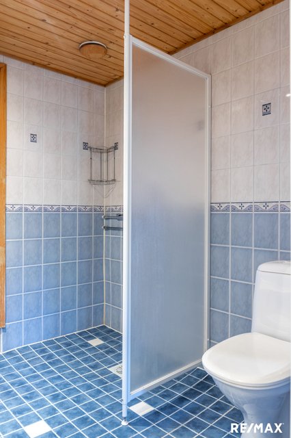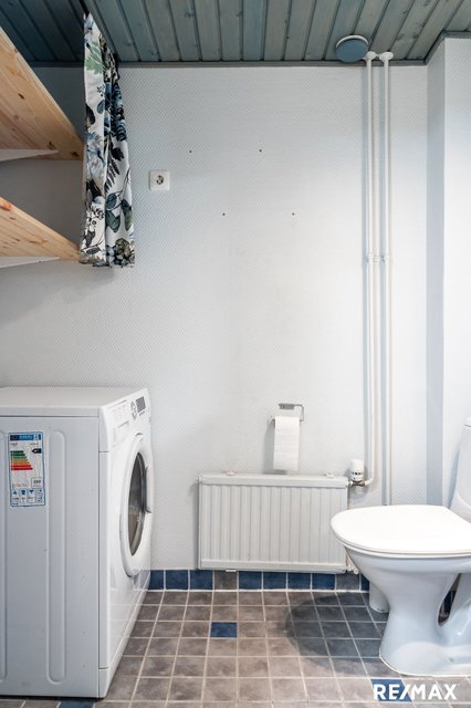 - Suihku, peili, pesuallas, allaskaappi, wc-istuin, suihkuseinä, ja pesukone
