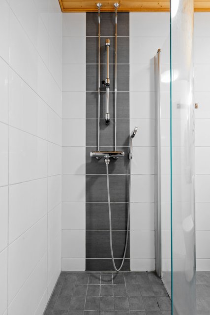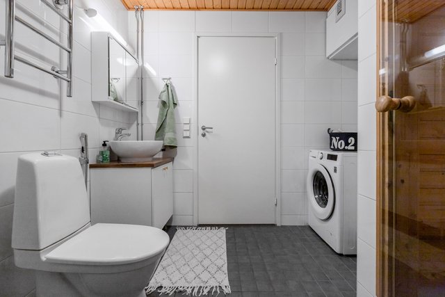 - WC-istuin, suihku, suihkuseinä, pesukoneliitäntä, lattialämmitys, peilikaappi, pesuallas, allaskaappi, bidee-suihku, ja pyyhekuivain