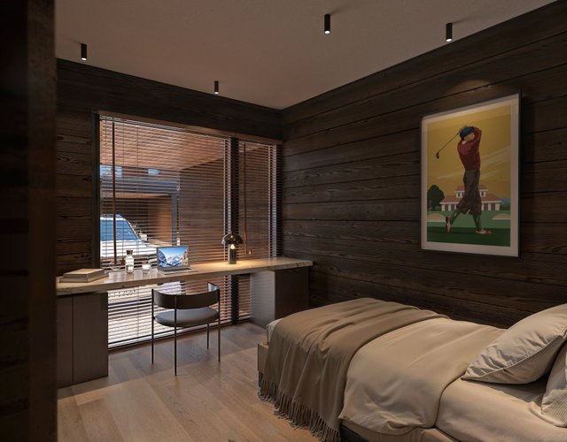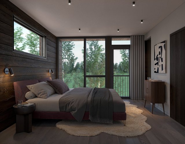 Makuuhuoneissa tunnelma on levollinen ja suojaava. Päämakuuhuone avautuu suoraan luontoon, ja sisustus jatkaa kodin hillittyä eleganssia – pehmeitä pintoja, lämpimiä sävyjä ja laadukkaita materiaaleja. Sauna ja kylpyhuone on suunniteltu rentoutumista varten: puupintoja, luonnollisia sävyjä ja hillittyä valaistusta.