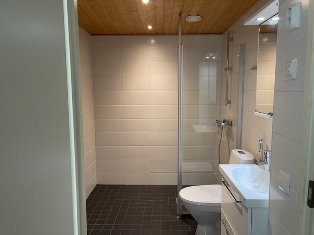 - Pesukoneliitäntä, suihkuseinä, wc-istuin, peilikaappi, ja suihku
