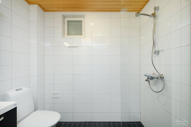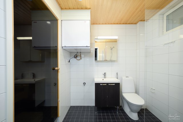 - Pesutiloissa suihku, suihkuseinä, wc-istuin, peili- ja allaskaappi ja tila pyykkikoneelle. Lattialämmitys.