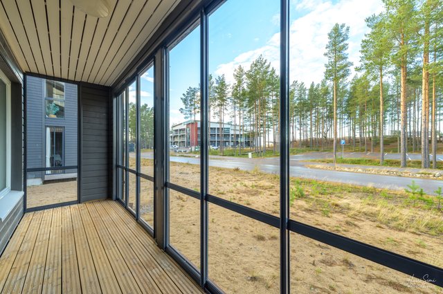 Lasitettu terassi, erillinen makuuhuone, oma sauna ja huoneistokohtainen ilmanvaihto ovat vakiovarusteita.