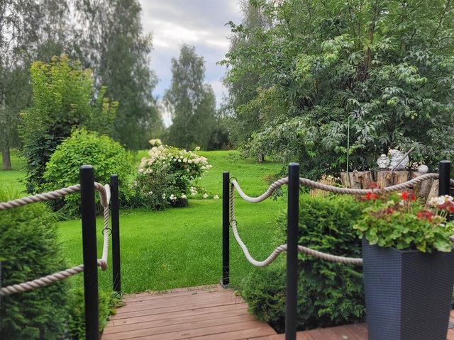 - piha- ja puistomäkymät. Terassi ja piha puistomaisin näkymin Suivanrannan suuntaan etelään