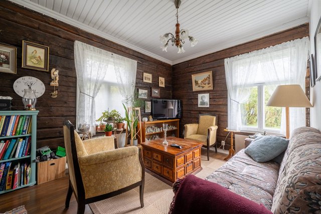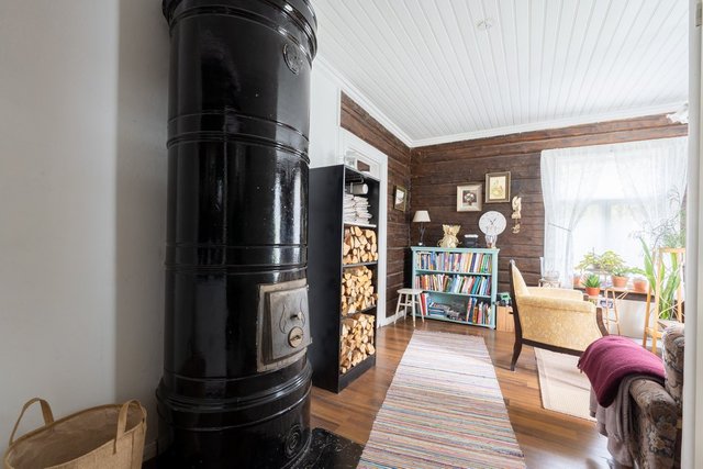 - Valoisa olohuone, jossa seinät hirsipinnalla ja kruununa musta pönttöuuni.