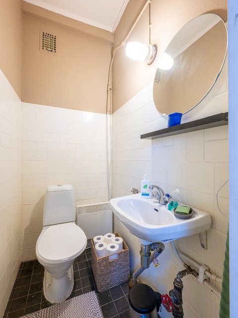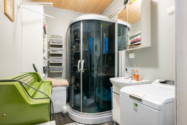 - Suihkukaappi, pesukoneliitäntä, peilikaappi, pesuallas, ja allaskaappi