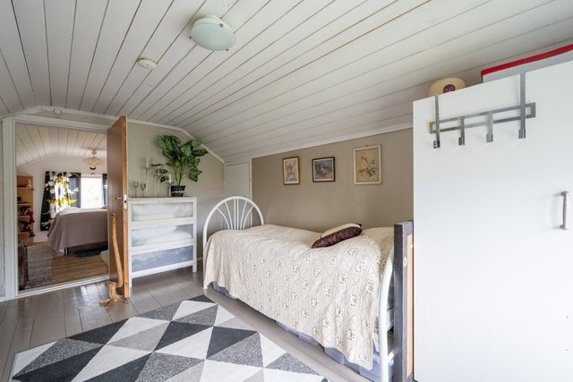 Yläkerrassa on kaksi makuuhuonetta, joiden yhteydessä on ullakkokomerotilaa. Talousrakennus sisältää autotallin, saunan, liiterin ja varaston, ja sen tilat ovat todellisuudessa suuremmat kuin ilmoitetut neliöt.