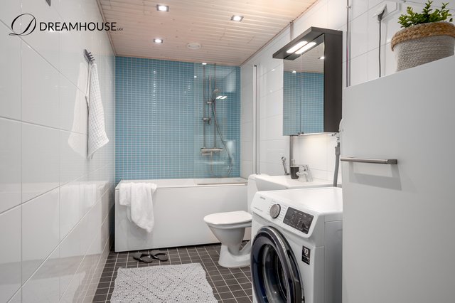 - WC-istuin, suihku, kylpyamme, pesukoneliitäntä, lattialämmitys, peilikaappi, pesuallas, allaskaappi, ja bidee-suihku