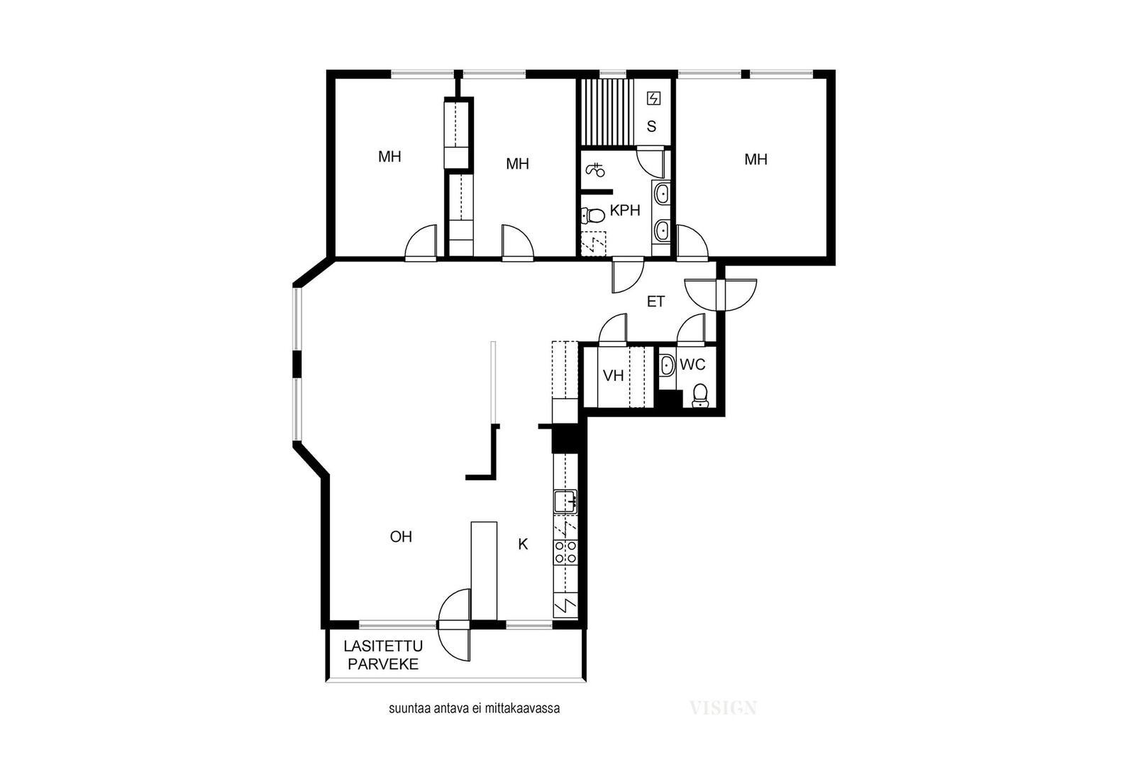 - Liesi, mikroaaltouuni, jääkaappi, erillisuuni, liesituuletin, erillinen pakastin, astianpesukone, ja kiinteät valaisimet