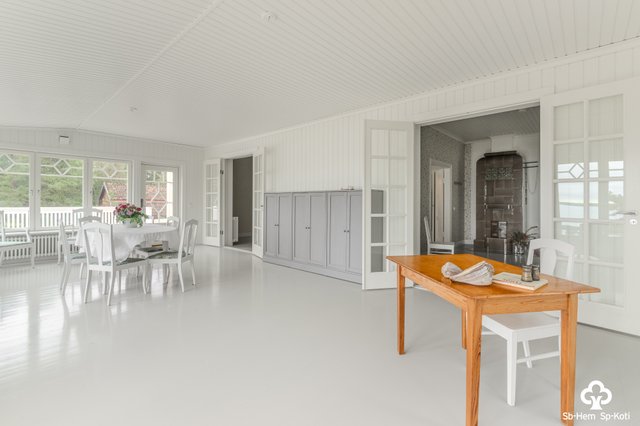 - Lasiverannalla lautalattia ja maalatut lautaseinät.