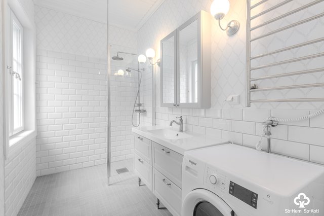 - Suihku, suihkuseinä, peilikaappi, lattialämmitys, pesuallas, allaskaappi, ja pesukoneliitäntä