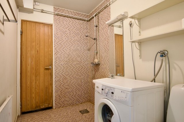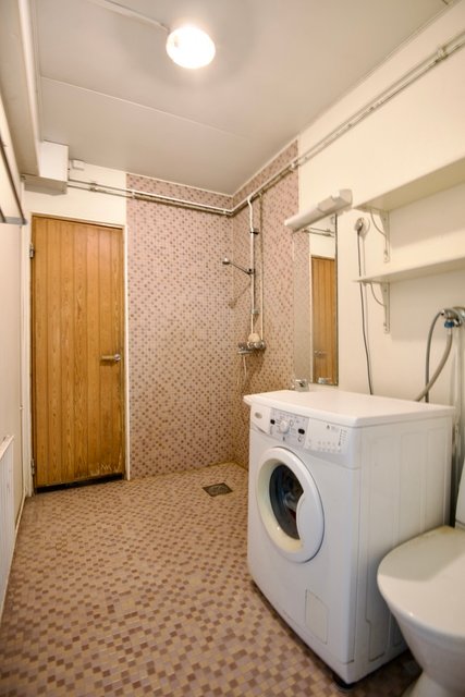 - Suihku, pesukoneliitäntä, peili, pesuallas, ja wc-istuin