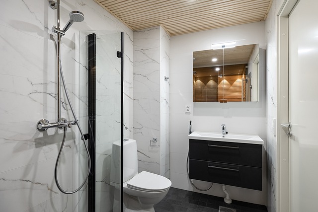 - Peilikaappi, suihkuseinä, allaskaappi, wc-istuin, suihku, lattialämmitys, ja kiinteät valaisimet