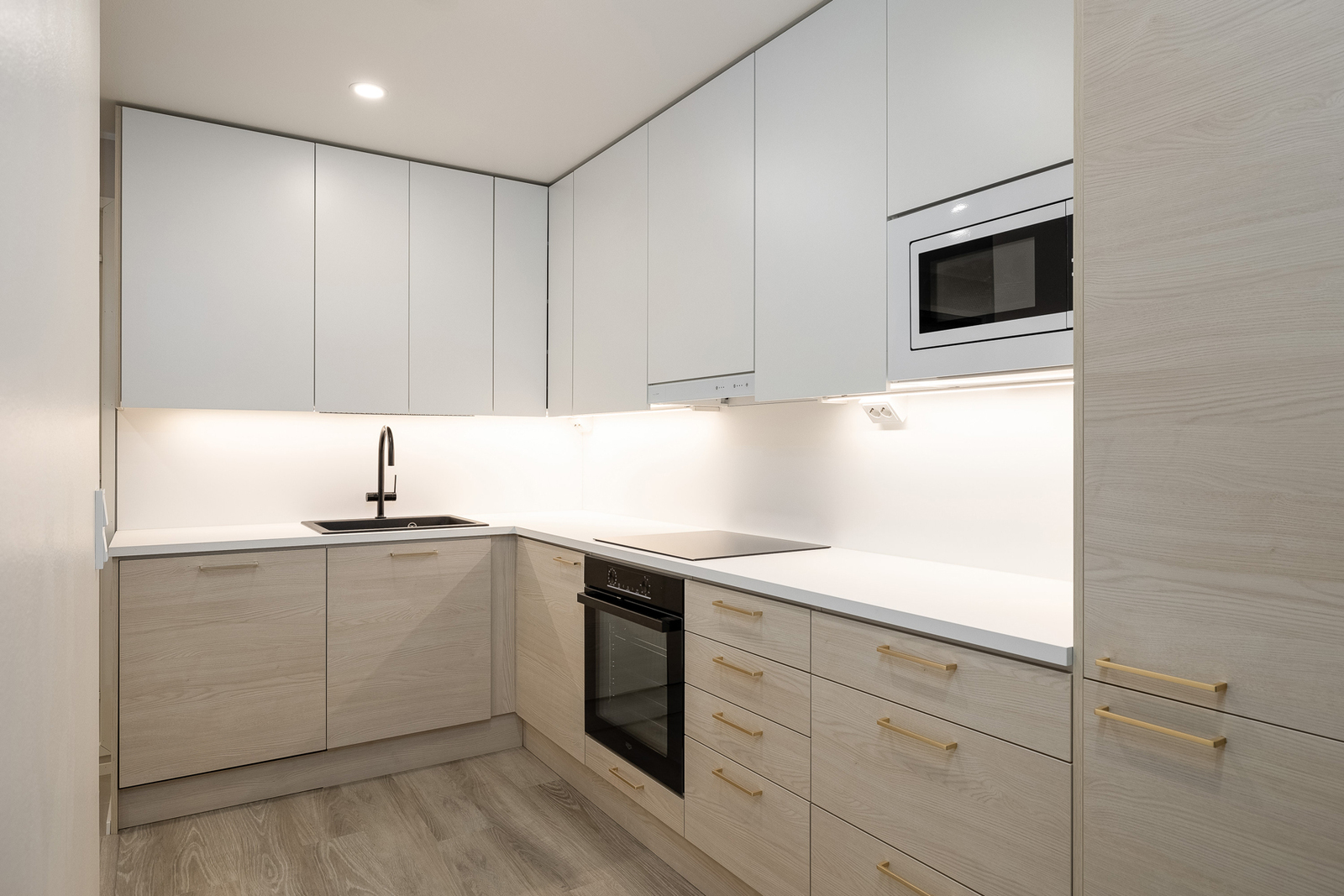 - Erillisuuni, jääkaappipakastin, mikroaaltouuni, liesituuletin, astianpesukone, ja liesitaso, kiinteät valaisimet