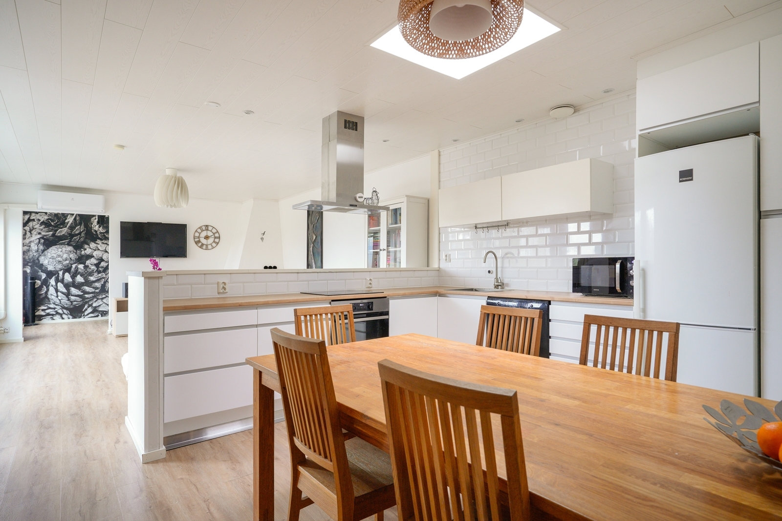 - Seinämateriaalit: yksi seinä puupaneelia, toinen laattaseinä sekä maalattu seinä. Keittiössä myös valoa tuova kattoikkuna. Uuni ja astianpesukone uusittu 2021