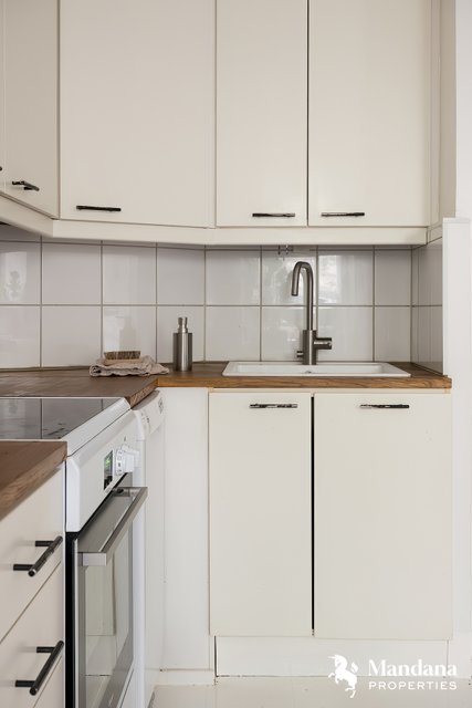 - VARUSTUS: Jääkaappipakastin, liesi, uuni, liesituuletin, astianpesukone, kaapistot, pesuallas, hana, komero. SEINÄT: Maali. VÄLITILA: Kaakeli. TYÖTASO: Puu. LATTIA: Lankku.