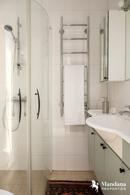 - VARUSTUS: Wc-istuin, suihku, kääntyvät suihkuseinät (lasi), pesuallas, allaskaluste, peili, peilikaappi, rättipatteri. SEINÄT: Laatta. LATTIA: Laatta.