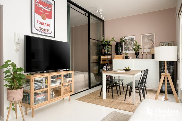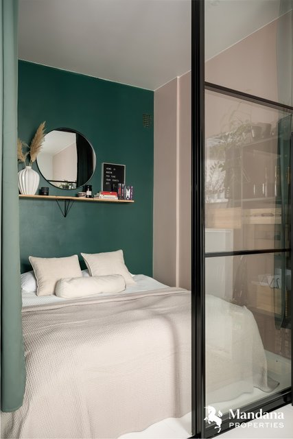- Makuuhuoneen ja olohuoneen välissä lasinen tilanjakaja liukuovella. SEINÄT: Maali. LATTIA: Lankku.