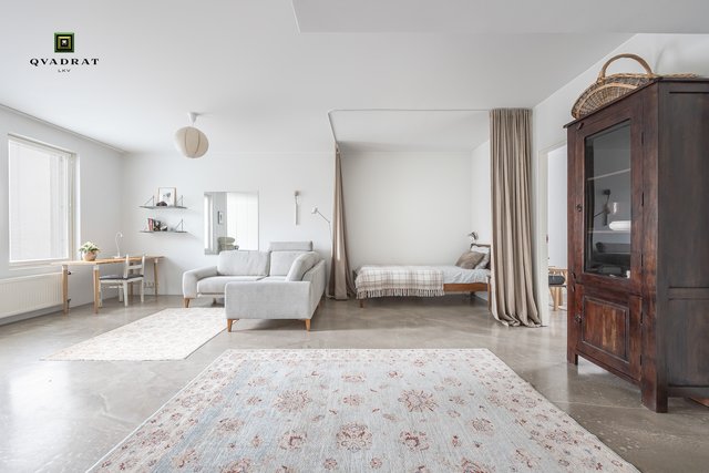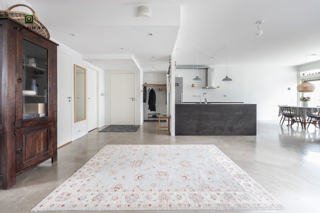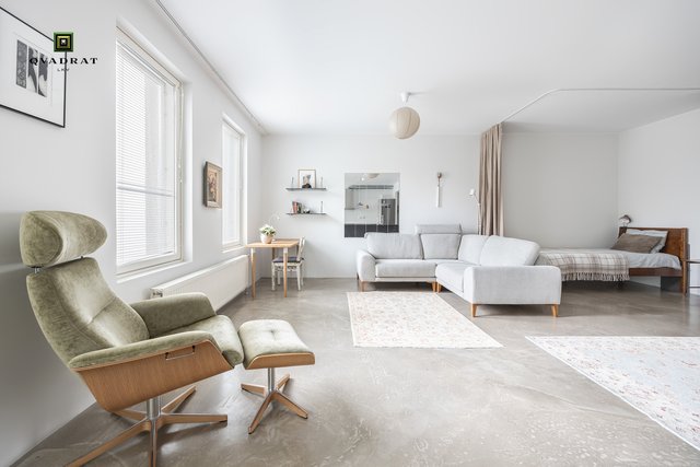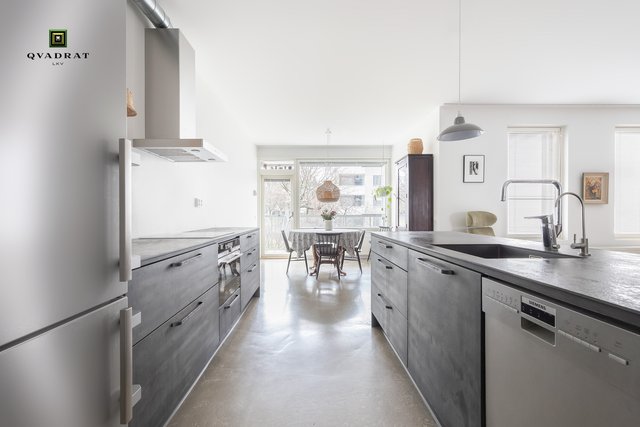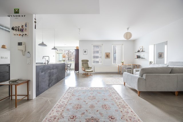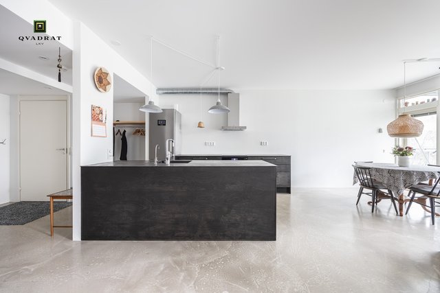 Huoneiston industrial look hurmaa heti. Yhtenäinen betonilattia, jossa kauttaaltaan lattialämmitys, avara pohjaratkaisu ja tyylikäs avokeittiö luovat ilmavan kokonaisuuden, jossa valo ja tila pääsevät oikeuksiinsa. Olohuone, ruokailutila ja parveke avautuvat puistomaisiin näkymiin, jotka elävät kauniisti vuodenaikojen mukana.