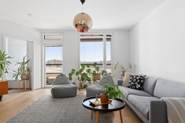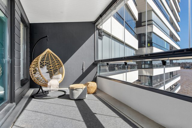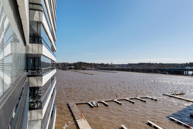 Olohuone on tämän kodin kruunu. Suuret ikkunat kehystävät merinäkymän kuin taulun, ja lasitettu iso parveke kutsuu nauttimaan auringosta ja merituulesta. Parvekkeen suuntaus on täydellinen – aurinko osuu tähän juuri silloin, kun haluat. Päämakuuhuone on tilava ja tarjoaa käynnin vaatehuoneen kautta suoraan kodin kylpy- ja saunatiloihin. Toinen makuuhuone sopii täydellisesti lastenhuoneeksi tai moderniksi työtilaksi – ja täältä on suora näkymä merelle. Ei ihan jokaisessa kotitoimistossa tällaista näköalaa ole.