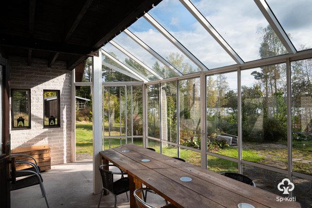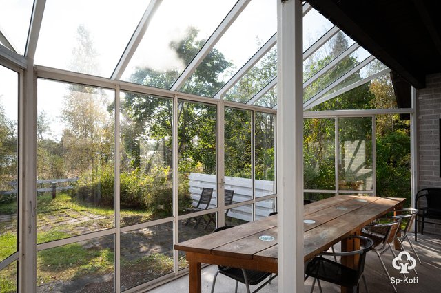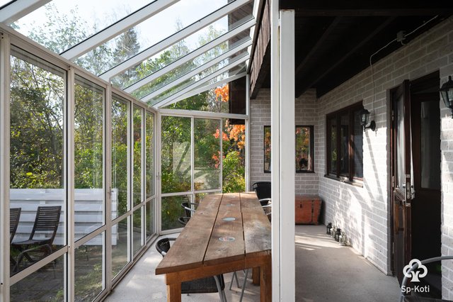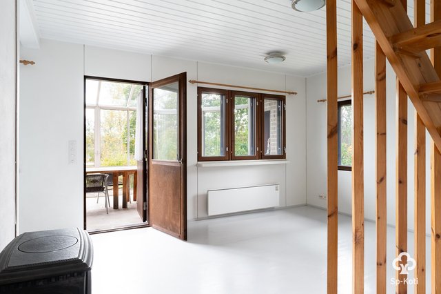 - Olohuoneesta kulku lasitetulle terassille. Seinät maalattu, lattia maalattu puu. Kamina.
