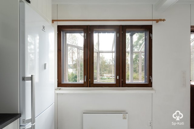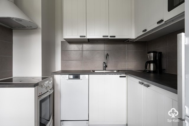- Keraaminen liesi, liesituuletin, astianpesukone, mikroaaltouuni, jääkaappi/pakastinkaappi, kaapistot ja tasot. Seinät maalattu, lattia maalattu puu.