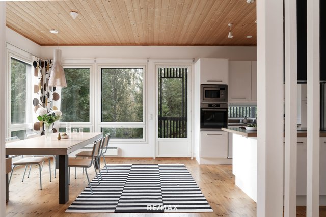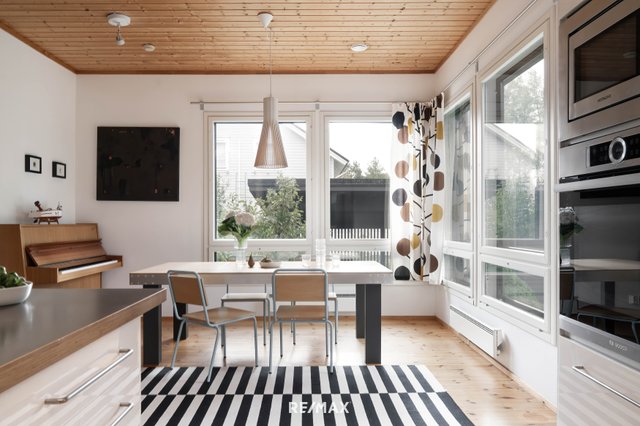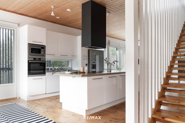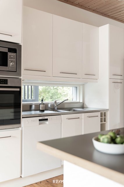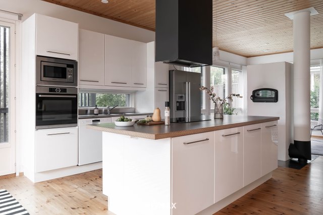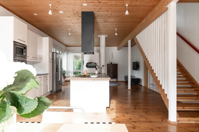 - - Tyylikäs avara kokonaisuus yhdessä olohuoneen kanssa. Moderni saareke tuo laskutilaa ja helpottaa kokkailua koko perheen voimin.