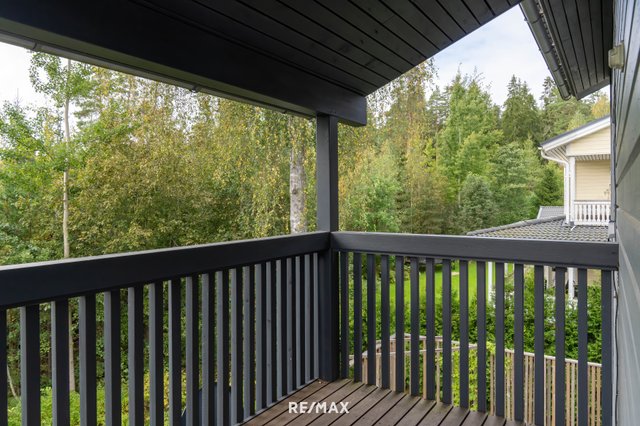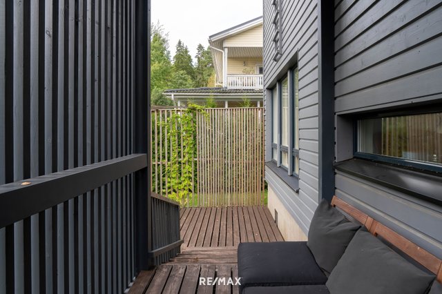 - Hieno iso terassi, johon asennettu säleiköt. Kodinhoitohuoneen oven edessä myös suojainen terassi, jossa mahdollisuus esim. kuivata pyykit.
