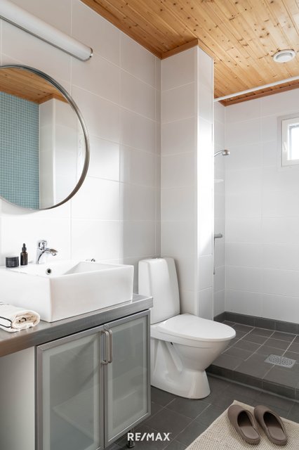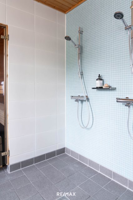 - - Alakerta: 2x suihku, lattialämmitys - Yläkerta: Suihku, lattialämmitys, WC-istuin, pesuallas, allaskaappi, bidee-suihku, peili