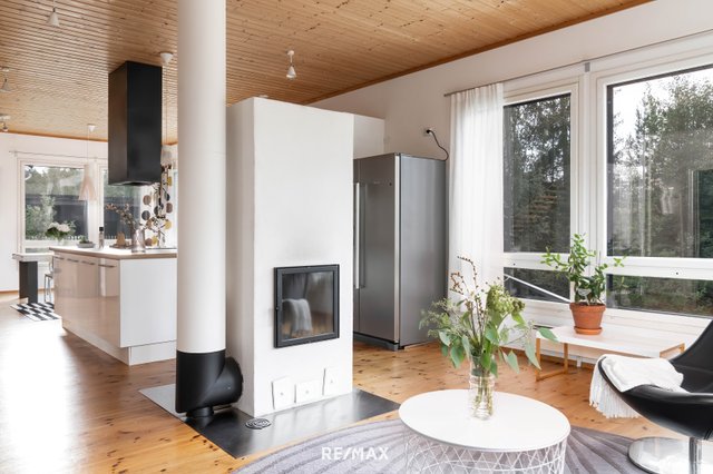 Tässä kodissa tilan tuntu tekee vaikutuksen heti eteisestä. Avaran olohuoneen ja keittiön yhtenäinen kokonaisuus kattaa lähes kaksi kolmasosaa koko alakerran tilasta. Keittiön moderni saarekeratkaisu kokoaa perheen ja ystävät kokkailun äärelle, ja olohuoneen varaava takka antaa pehmeän lämmön pimeneviin iltoihin. Valo kulkee tilasta toiseen, ja selkeä pohja helpottaa arkea. Harmoninen yhdistelmä vaaleita sävyjä ja luonnollista puuta luo rauhoittavan tunnelman; sellaisen, että tänne on helppo astua sisään ja tuntea olevansa kotona.