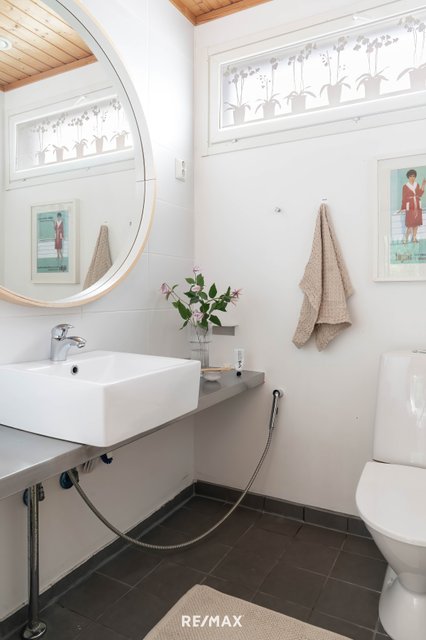Alakerran pesuhuoneessa on kaksi suihkua ja lattialämmitys, mikä sujuvoittaa pesuhetkiä isommallakin porukalla. Yläkerrassa toinen kylpyhuone suihkun ja lattialämmityksen kera, joka täydentää toimivuutta. Saunassa löylyihin mahtuu mukavasti jopa kuusi henkilöä (tai enemmänkin), ja kiuas on uusittu vuonna 2017. Kodinhoitohuoneesta on suora käynti ulos suojaisalle terassille, jossa esim. pyykit kuivuvat kätevästi. Lisäksi erillinen wc-tila helpottaa vilkasta arkea.