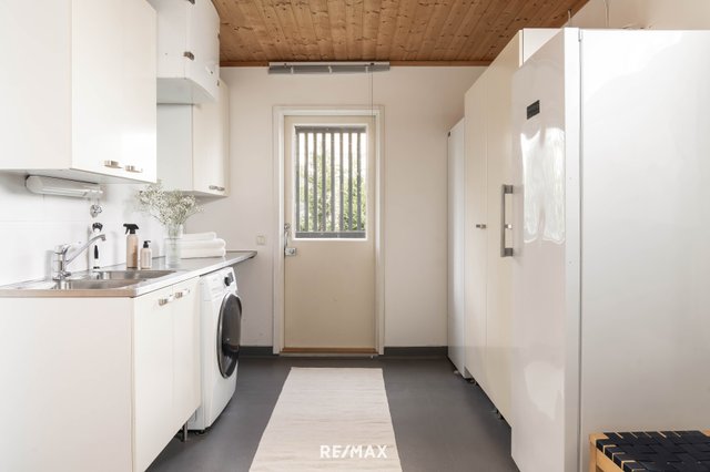 - Pesukoneliitäntä, pesuallas, lattiakaivo, pyykkikaapit, tila pesutornille, pöytätaso, lämminvesivaraaja, ilmanvaihtokone, ja lattialämmitys