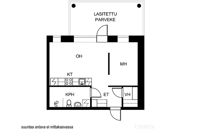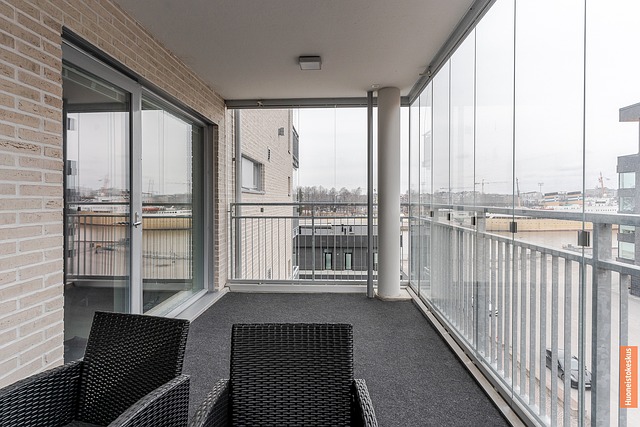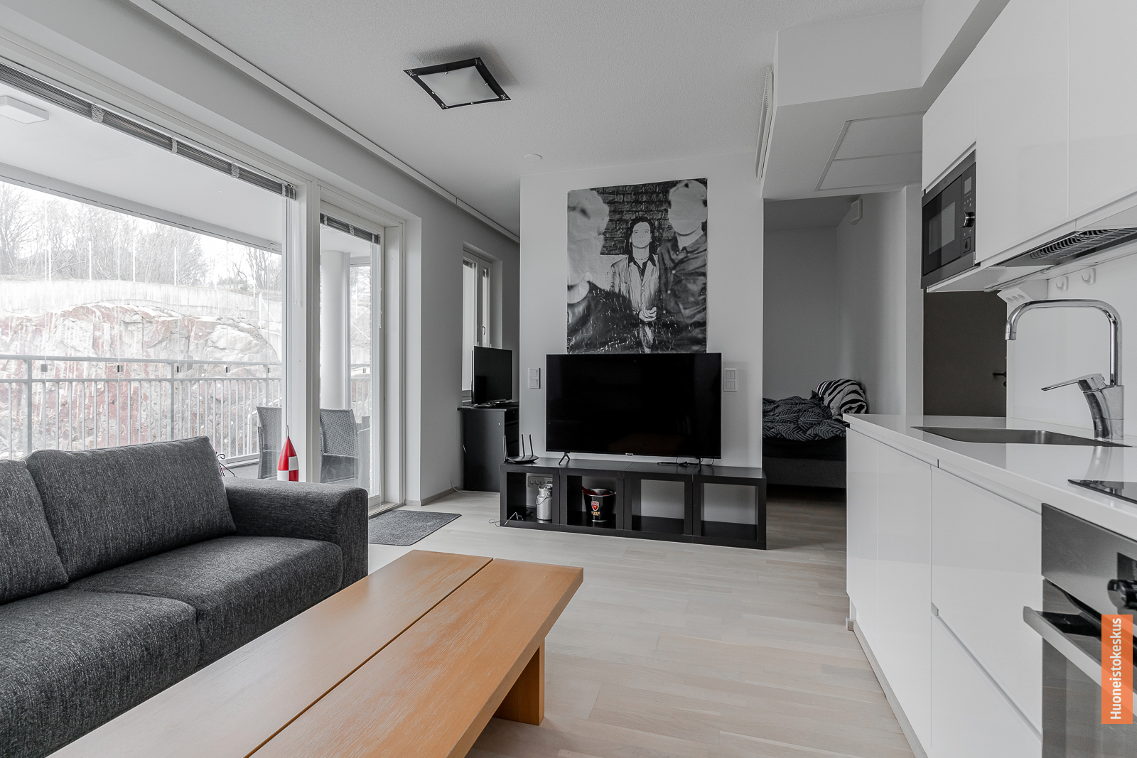 Asunnon neliöt on toteuttu tehokaasti mikä tekee siitä erityisen houkuttelevan. Valkolakattu tammiparketti luo tilaan tyylikkään ilmeen, joka sopii täydellisesti yhteen modernin tyylin kanssa. Isot ikkunat tuovat asuntoon valoa mukavasti. Asunnon suuri lasitettu parveke tarjoaa mahtavat lisätilat eri vuodenaikona.