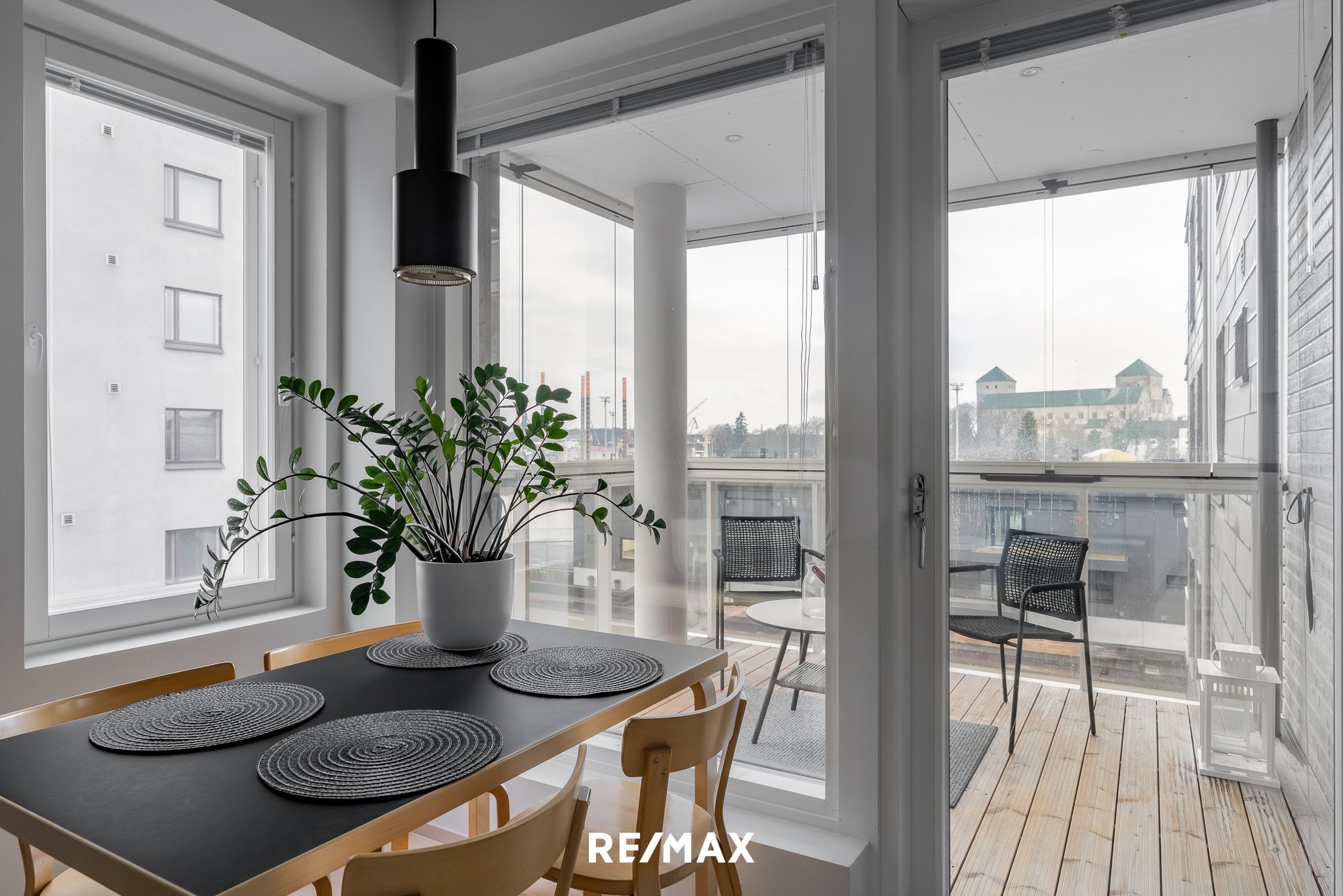 Tämä kolmannen kerroksen huoneisto on ollut vähällä käytöllä nykyisen omistajan kakkosasuntona, mikä näkyy materiaaleissa ja pinnoissa sillä kohde on lähestulkoon uuden veroinen! Asunnon omassa saunassa rentoudut arjen keskellä ja isolla lasitetulla parvekkeella pääset vilvoittelemaan löylyjen jälkeen. Parvekkeelta on huikeat näkymät Aurajoelle ja Turun linnalle ja voit myös katsella kun ruotsinlaivat lipuvat rantaan.