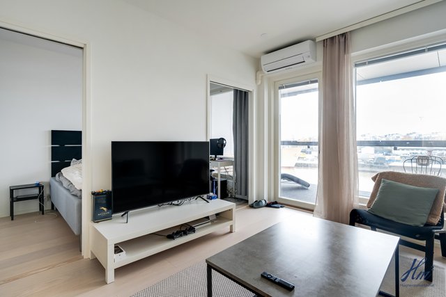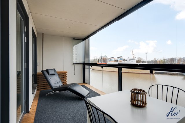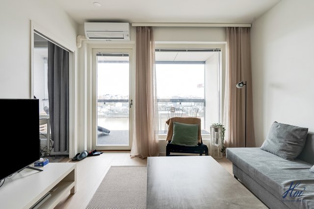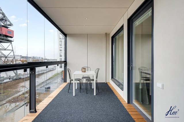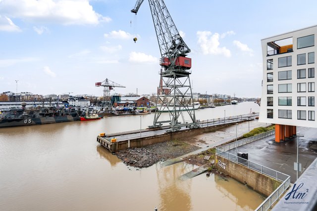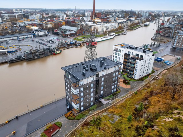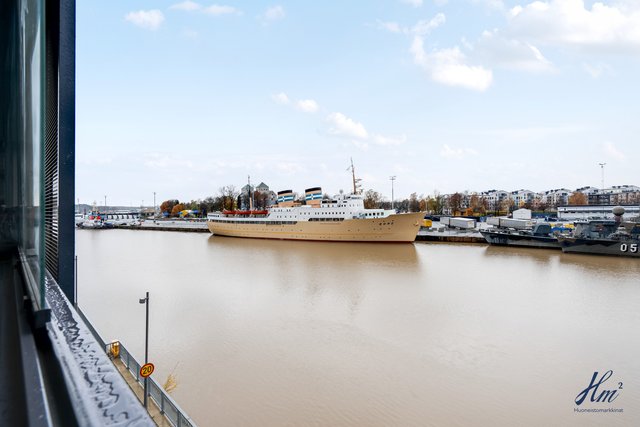 Asunnossa nautitaan erityisen hyvästä yksityisyydestä, ja lasitetulta parvekkeelta avautuu harvinaisen esteettömät näkymät Aurajoen molempiin suuntiin. Parveke on noin 8 metriä maanpinnasta, joten jokimaisemaa voi ihastella juuri oikealta korkeudelta ja veneliikennettä on helppo seurata. Tähän huoneistoon ja parvekkeelle tulee ilta-aurinko mitä parhaiten sijoittelunsa ansiosta. Koti sijoittuu talon kolmanteen kerrokseen, joka on tavanomaista korkeammalla tarjoten kauniin kaupunki-/jokimaiseman. Olohuone sekä keittiö muodostavat viihtyisän tilan, ja avaruuden tuntua lisäävät suuret ikkunat. Pohjaratkaisu on onnistunut, ja hyvin suunnitellut lisätyöt lisäväät tämän huoneiston tasoa entisestään. Kesähelteen jäähdytyksestä huolehtii huoneistokohtainen ilmalämpöpumppu.