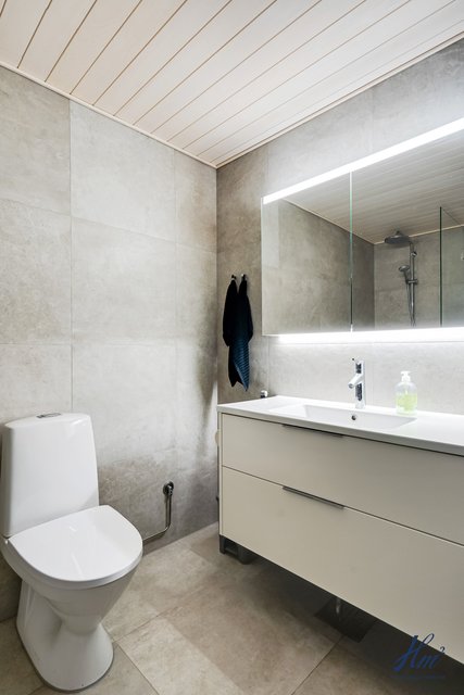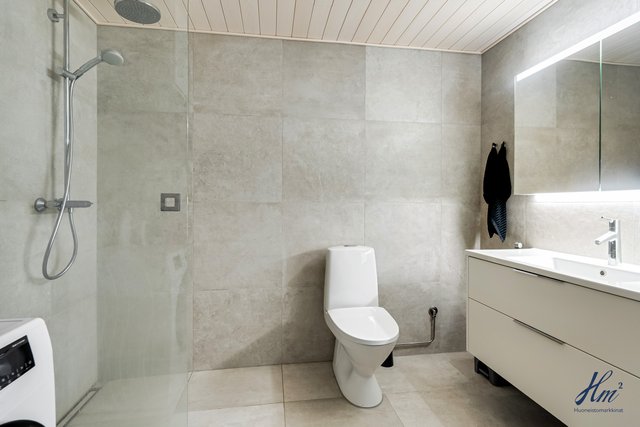 - Wc-istuin, Bidee-suihku, pesuallas, allaskaappi ja valaisimella varustettu peilikaappi. Suihkutilassa kääntyvä suihkuseinä. Seinät ja lattia isoa 600x600 laattaa ja ns. Linjalattiakaivo seinän vieressä, sekä lattialämmitys. Katto vaaleaksi käsiteltyä haapapaneelia.