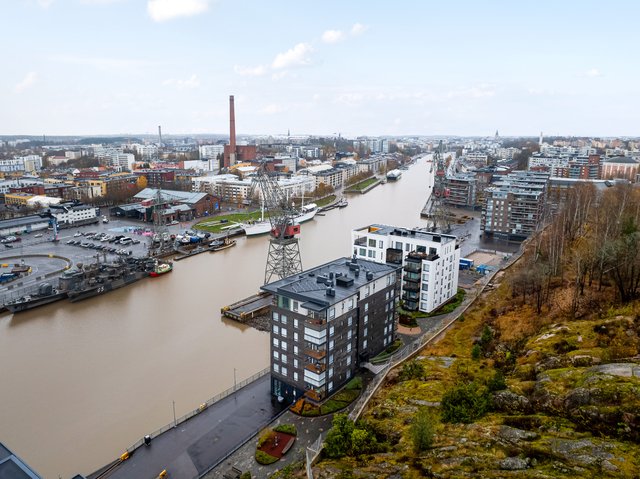 Uuden karhea huoneisto, jonka parvekkeelta on Aurajoelle vain 6 metriä.